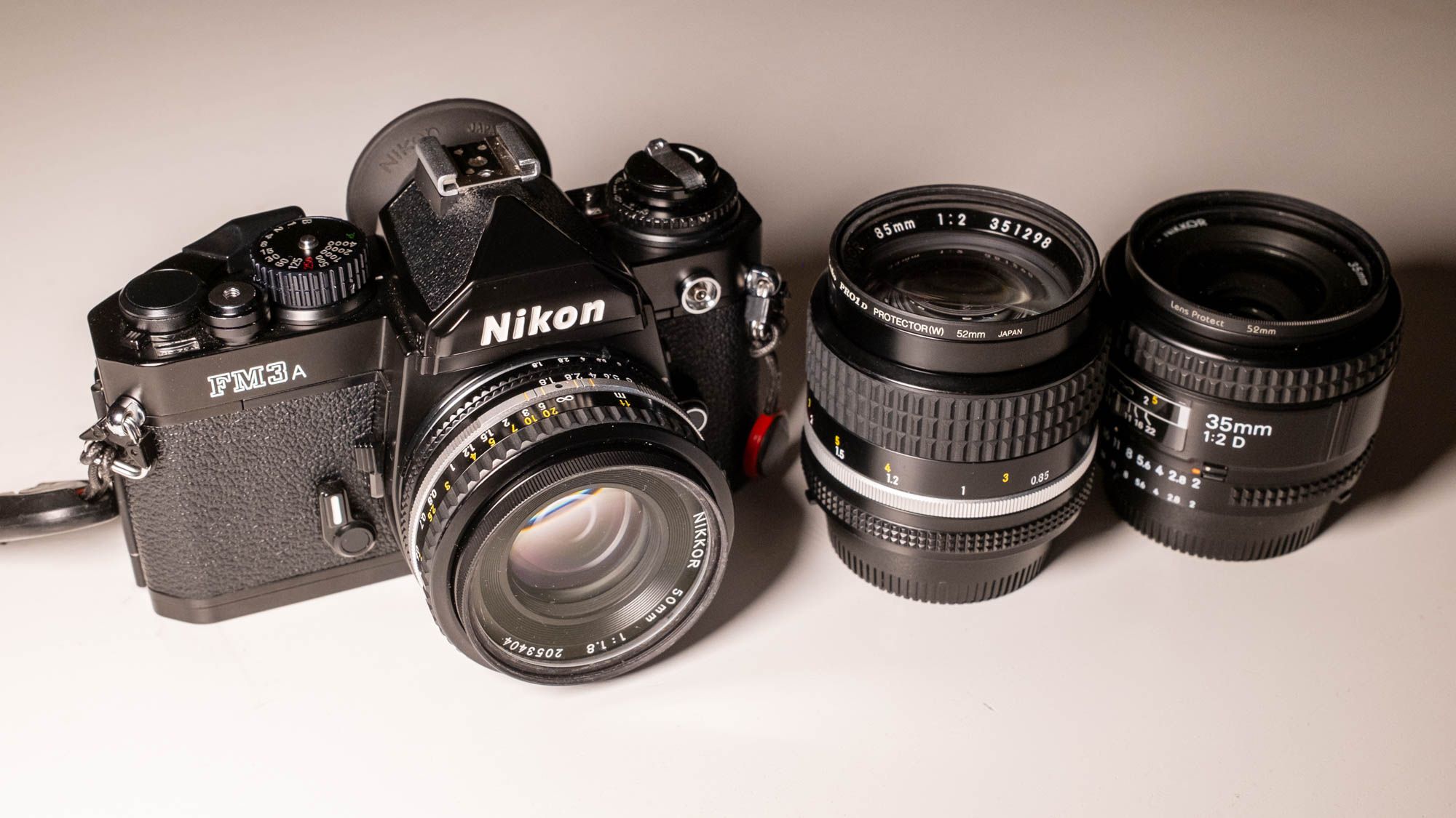 35mm, 50mm, 85mm lenses and the camera body – all from the golden age of Nikon and all in practically new condition – for a bit more than a grand ($1200).